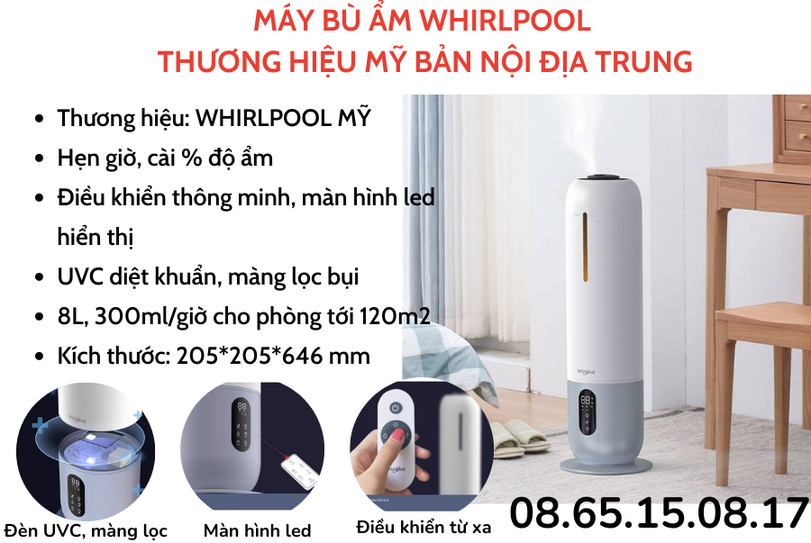 Máy bù ẩm WHIRLPOOL 8L là 1 phiên bản mang tính đột phá, cải tiến của tập đoàn gia dụng WHIRLPOOL. Sản phẩm được bán tại thị trường nội địa Trung Quốc.