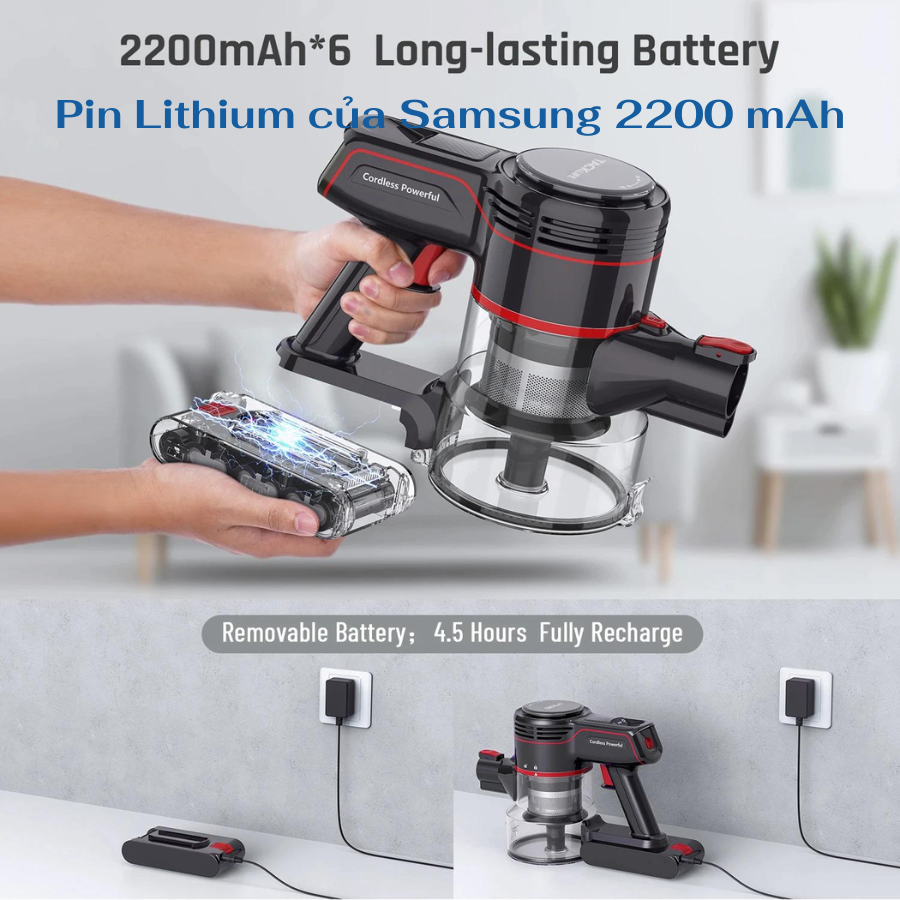 Máy hút bụi không dây cầm tay BENHEIM V20 sử dụng pin LITHIUM ION không axit, không chì với dung lượng 2200 mAh cao cấp, có thể hoạt động liên tục đến 50 phút.