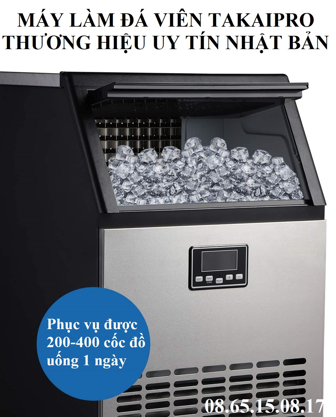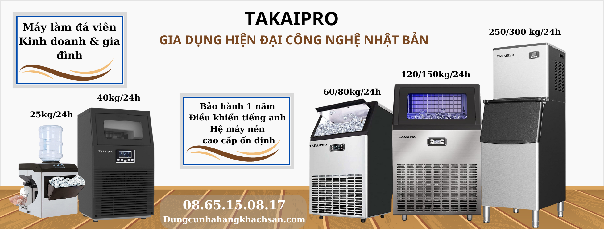 - Hiểu được mong muốn và sự cần thiết của thị trường, thương hiệu " TAKAIPRO" của Nhật Bản đã nghiên cứu và phát triển các dòng máy làm đá dành cho kinh doanh như 40, 60, 80, 120, 150, 250 Kg/ngày