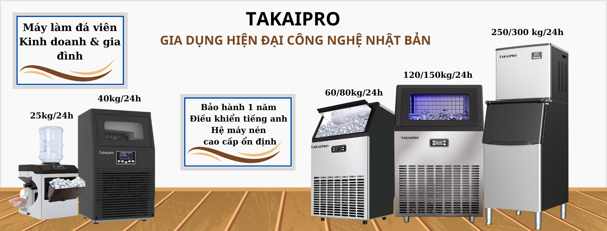 • Hiểu được mong muốn và sự cần thiết của thị trường, thương hiệu " TAKAIPRO" của Nhật Bản đã nghiên cứu và phát triển các dòng máy làm đá dành cho kinh doanh như 40, 60, 80, 120, 150, 250 Kg/ngày