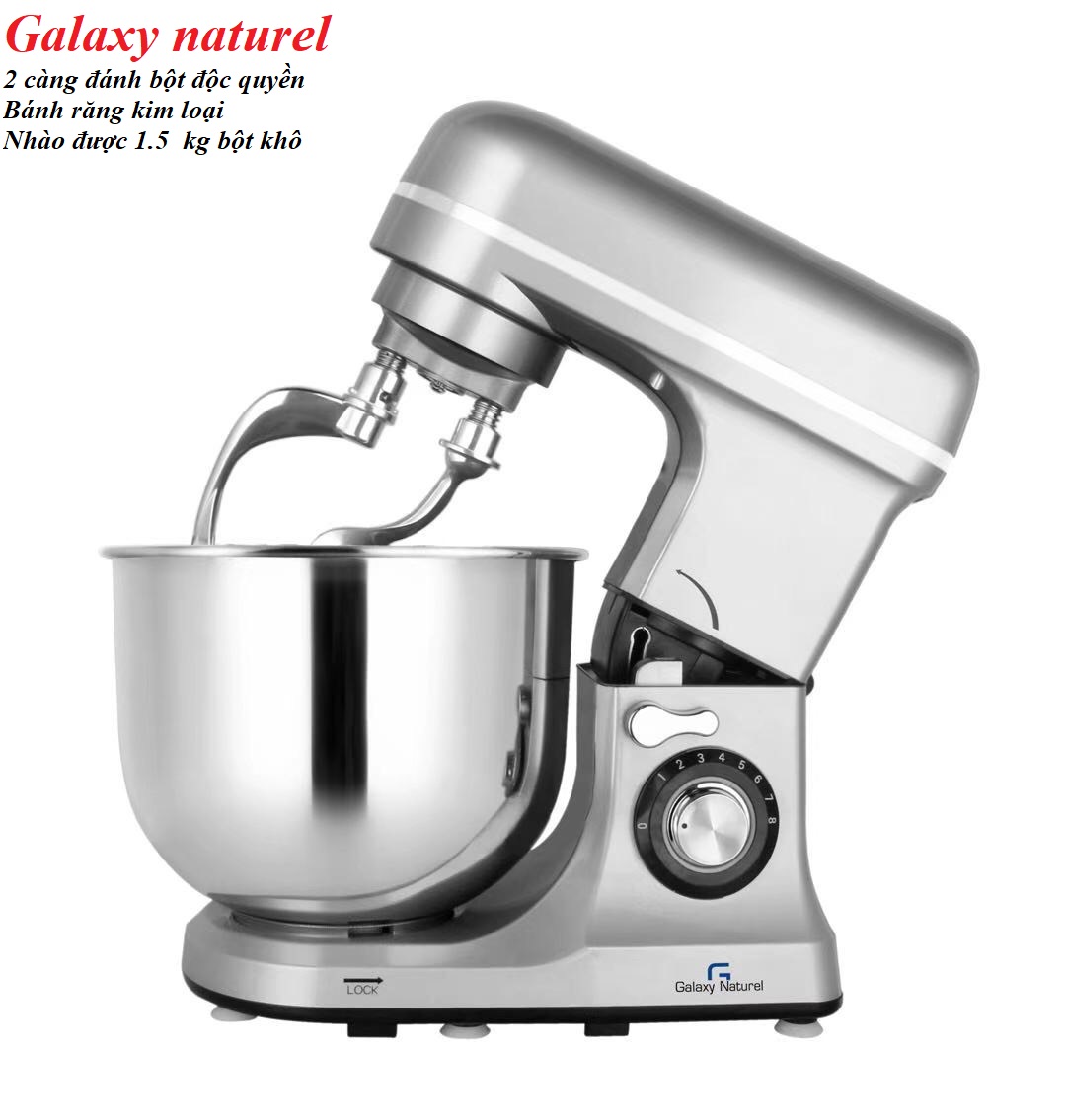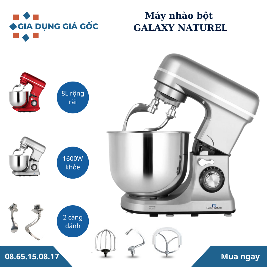 - Sản phẩm: Máy nhào bột công nghiệp GALAXY NATUREL 8L 1600W là phiên bản cao cấp công nghệ càng đánh trứng đôi được cấp bằng sáng chế của Mỹ có ưu điểm vượt trội giúp nhào được nhiều bột, nhiều bột như là sử dụng bằng tay. Sản phẩm máy nhào bột GALAXY NATUREL có thể đánh được 2 kg bột khô trong 2 phút 1 ( Xem video để rõ hơn)
