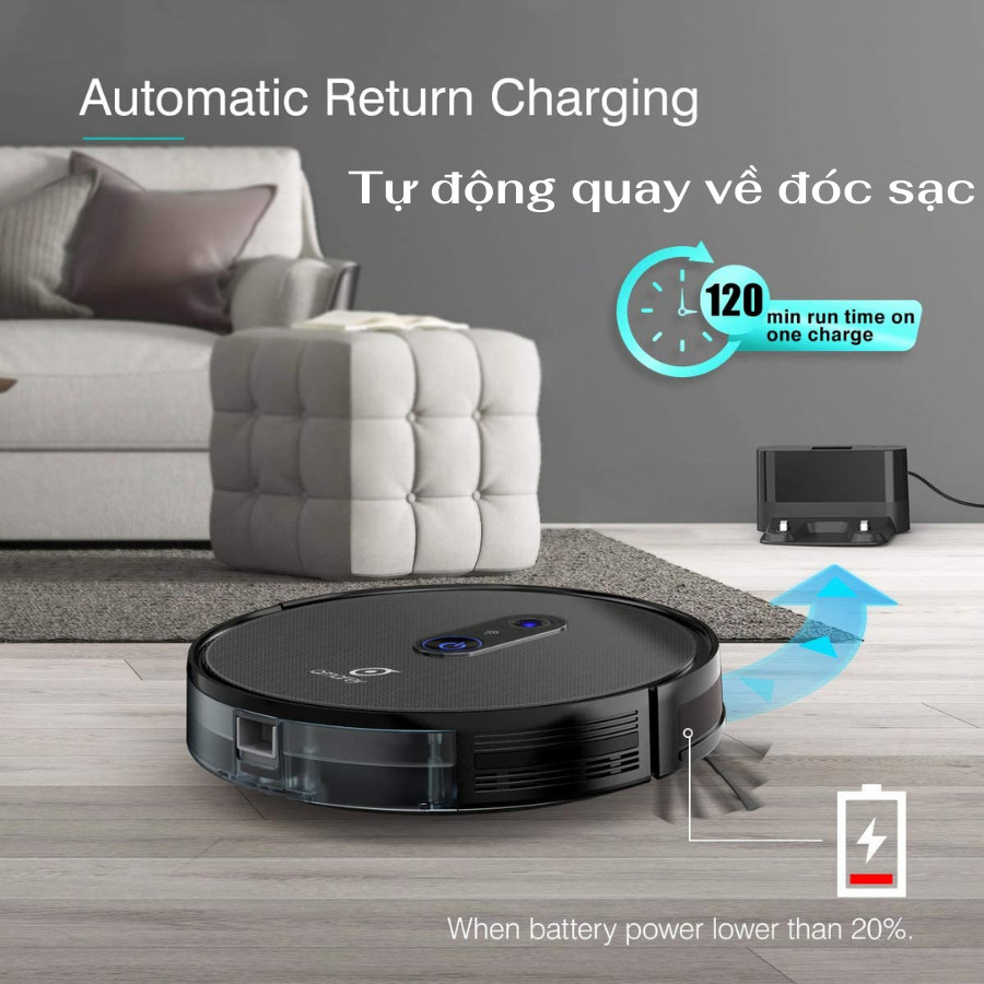 Chạy tối đa 120 phút, sau khi robot hút bụi A980 sắp hết pin, nó sẽ tự động quay trở lại đế sạc để tự sạc lại. Tự động quay lại và sạc có nghĩa là A980 luôn sẵn sàng để làm sạch.